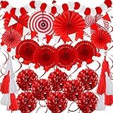 ZERODECO - Decoración de fiestas, 21 abanicos de papel rojo para colgar, pompones, guirnaldas y banderines triangulares para fiestas de cumpleaños, fiestas del bebé, bodas